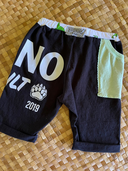 Unique up-cycled style with large hip pocket and contrasting elastic waistband. Slim fit (when in doubt, choose a bigger size for stout bodies). Knee length. Each hand-made pair is one-of-a-kind.